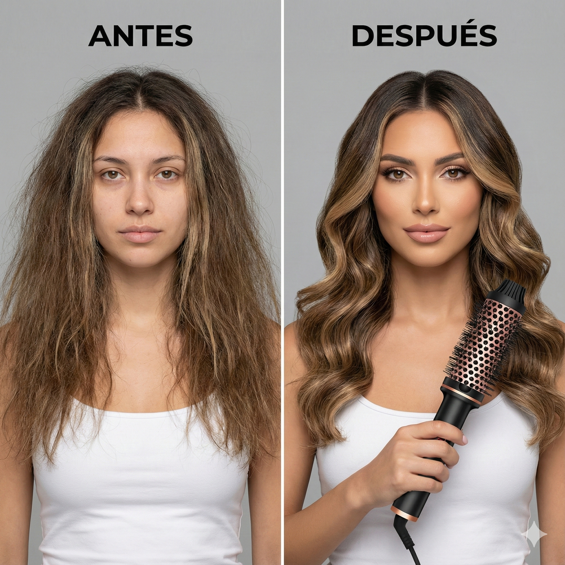 Para un look liso y pulido, pasa el cepillo directamente hacia abajo. Si prefieres ondas o rizos con movimiento, enrolla las puntas y suelta con suavidad para un acabado impecable digno de salón. ✨